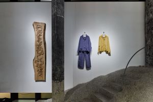 ・入口正面の壁面では、高さ2メートルを超える髙山瑞の大作とCHNEIDERの衣服が鑑賞者を迎える。かつて自然の中で寄り添っていたであろう「樟」と「麻」が、異なるかたちへと姿を変え並立します。