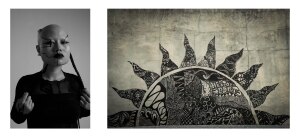 沖縄のツルやヘゴの植物といった、南国特有の植生に着目。植物の持つ繊細な造形や有機的なシルエット、独特な質感からインスピレーションを得て、それらを模様として再構築し、表現へと昇華させている。自身の作品では、植物が内包する脆弱さと力強い生命力という二面性に着目し、それを壁画やキャンバス、人体に描き出す。特に、コンクリートやブロック塀の隙間からも生き抜こうとする根性草を象徴的モチーフとし、人工物と自然のせめぎ合いの中でもしたたかに生き抜く草の姿を、力強くかつ繊細な植物模様として描いている。