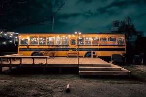 アメリカからやってきた黄色いスクールバスを改装した古書店です。