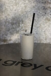 WALL_alternativeのシグネチャーメニューのバニラシェイクに「和田萬」の国産黒ごまを加えたGREY ART MUSEUM限定「自家製黒ごまシェイク」。